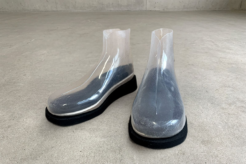 木型を完成させるために、中が透けて見える「確認用の透明な靴」で試し履きを行います。